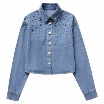 Women’s Diamond Embellished Denim Blouse – Casual Chic Short Shirt
