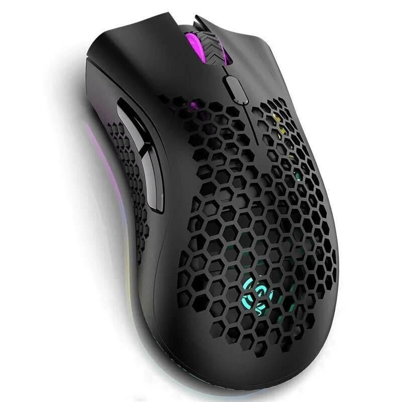 Our Wireless RGB Gaming Mouse shines when it comes to gaming marathons, intense design work, or any task that requires finesse and precision. The honeycomb design is more than just visually arresting – it’s a declaration of lightweight durability and aerated comfort that keeps your gaming sessions cool and uninterrupted. The vibrant RGB lighting isn’t just for aesthetics; it sets the mood and immerses you fully into the gaming universe.